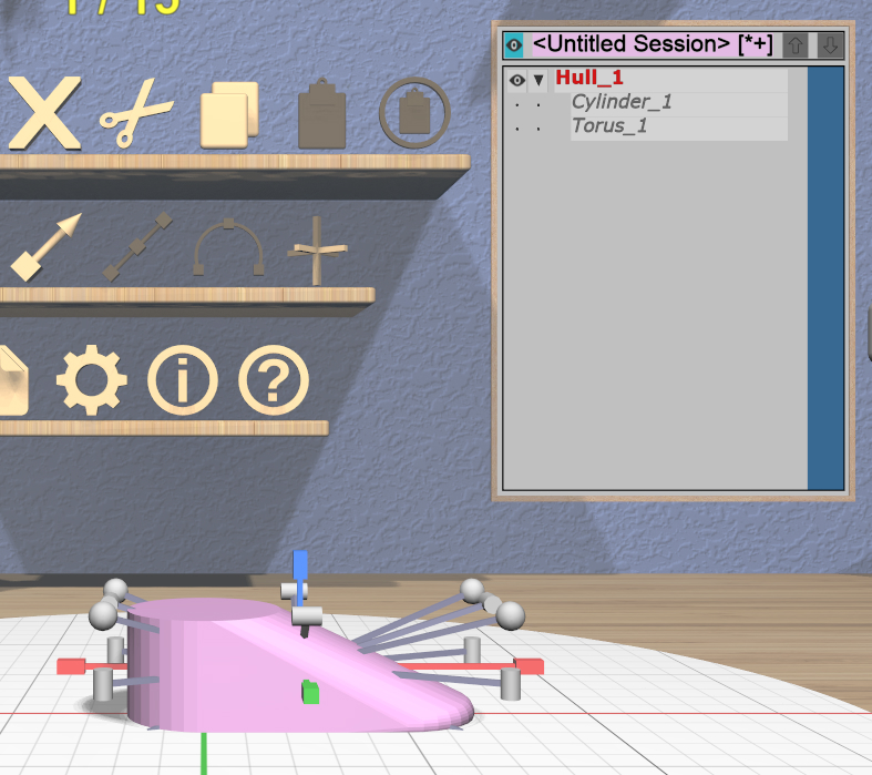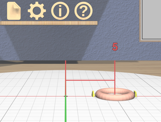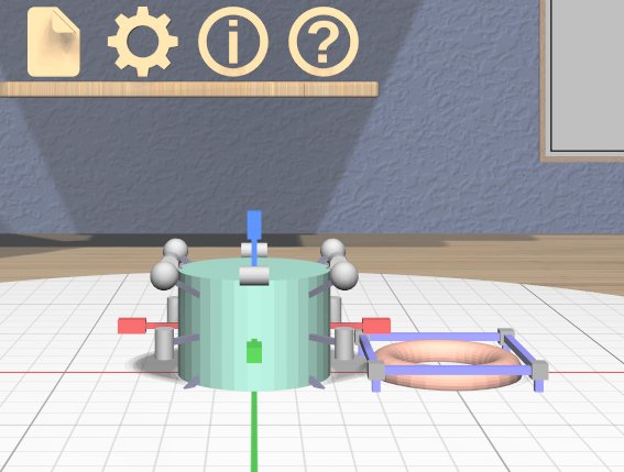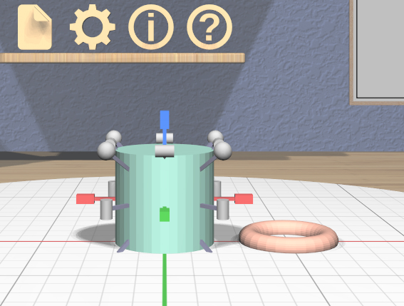 Click on the 3D torus icon on the bottom-left shelf to drop a new torus model into the scene. The torus will have some interactive handles attached to it that you can use to change the sizes of the outer and inner diameters. You can leave them at their default sizes for this example. If you change them and want to undo your changes, you can click on the 3D undo icon on the top shelf on the back wall or use Ctrl-Z.