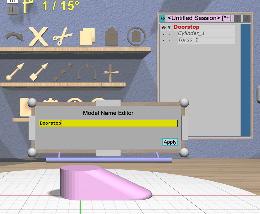 Click in the text input area to activate it, and change the name of the model to Doorstop. Click the “Apply” button to change the model name; the new name should be shown in the Tree Panel.