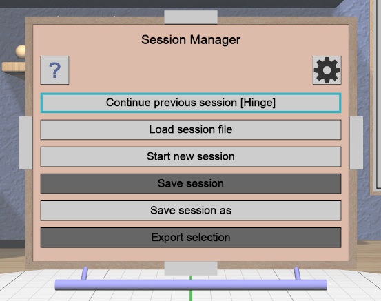 Starting the application should open a maximized window that you can interact with using the keyboard and mouse. The first thing you should see is this panel that lets you interact with sessions. Click on the Start new session button to start a new session (or just hit the Escape key).
