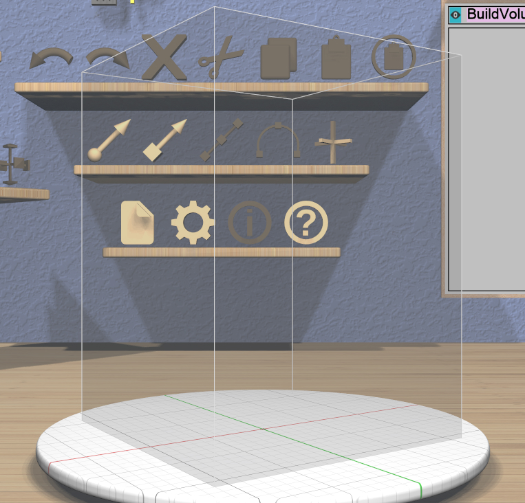 If you want to make sure that your models will fit within your 3D printer’s build volume, you can choose to display the build volume on the stage by clicking on the Build Volume Toggle icon on the Viewing Shelf. The build volume is rendered as a translucent box. You can specify the size of the build volume for your specific printer in the ref:Settings Panel <ug-settings-panel>.