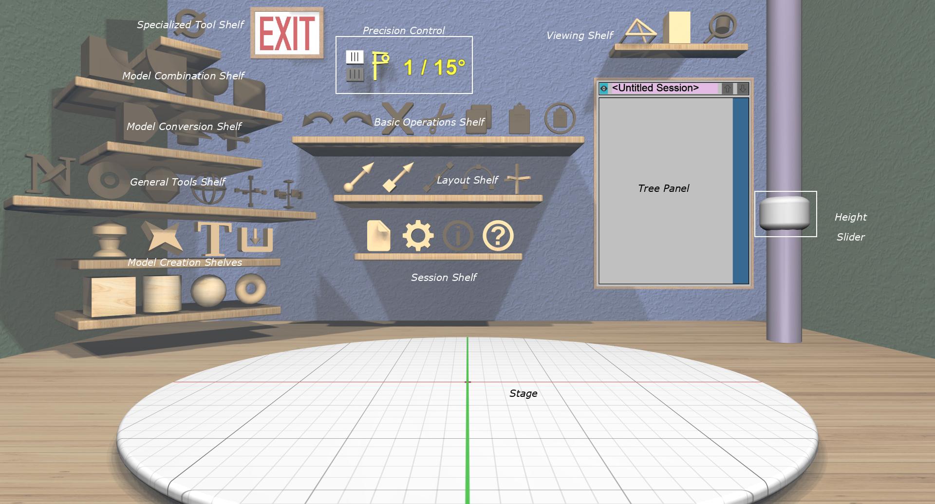 Because EasyMaker3D is designed to be used in VR as well as in a conventional mouse+keyboard environment, it cannot rely on typical menu-based interaction. Instead, it uses a fully 3D interface (with some 2D panels embedded in it).