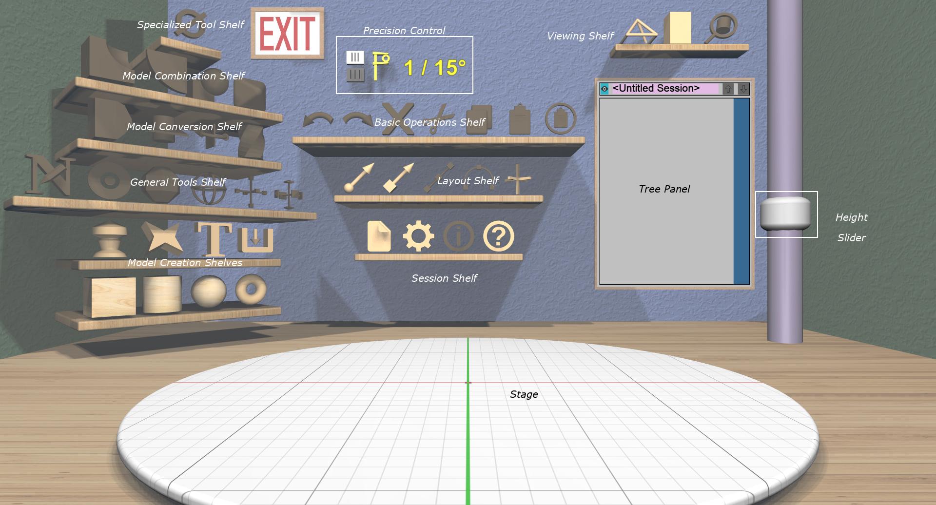 A large disc in the middle of the floor with a grid on it. This is the Stage on which models are built. It provides interaction for viewing the models.