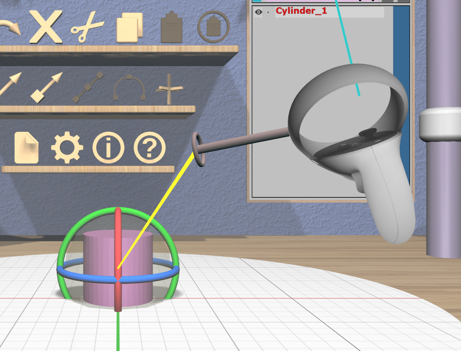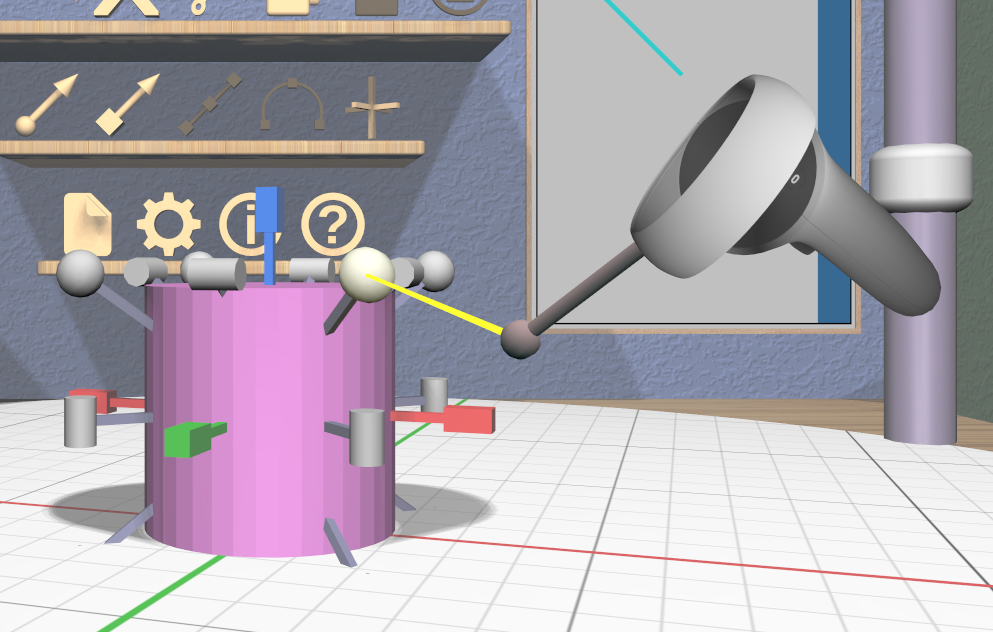 Grip dragging uses the orientation of the VR controller to choose a translation axis. The hover guide for each controller will show a color-coded connection to the handle closest to the guide’s orientation, if any, as shown in the images.