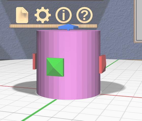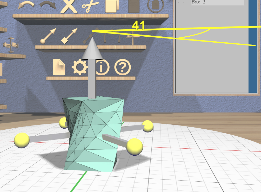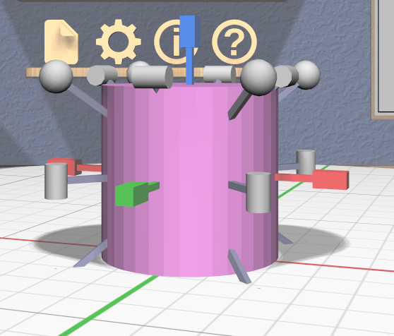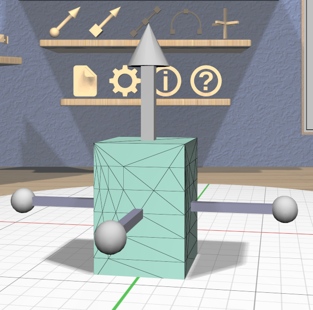 Three color-coded scalers are aligned with the coordinate axes of the model. These scale (nonuniformly) in a single dimension. Each handle of these scalers is a rectangular box that is longer in the dimension that will be scaled.